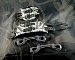 These dual wrist restraints are formed from a solid piece of white 8 ounce leather, lined with black deer suede and hand-stitched. Ideally suited for light-medium BDSM play. They are studded with a total of twenty 1 1/4" rivet back spikes.